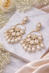 Add elegance to your jewelry collection with these stunning pearl chandelier earrings. Designed with delicate pearl drops and a graceful floral pattern, these statement earrings bring a perfect blend of luxury and charm. Ideal for weddings, parties, and festive occasions, they beautifully complement both traditional and modern outfits. Lightweight and stylish, these earrings are crafted to enhance your look with timeless sophistication.